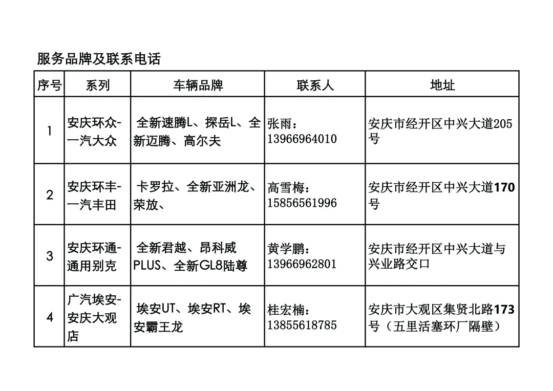 為感謝安慶職業(yè)教育集團對安徽環(huán)新集團及下屬子公司的關(guān)心支持,安徽環(huán)新集團下屬公司安慶環(huán)新汽貿(mào)投資有限公司特制定安慶職業(yè)教育集團教職工《購車、修車、續(xù)保》優(yōu)惠方案,提供以下服務(wù)。